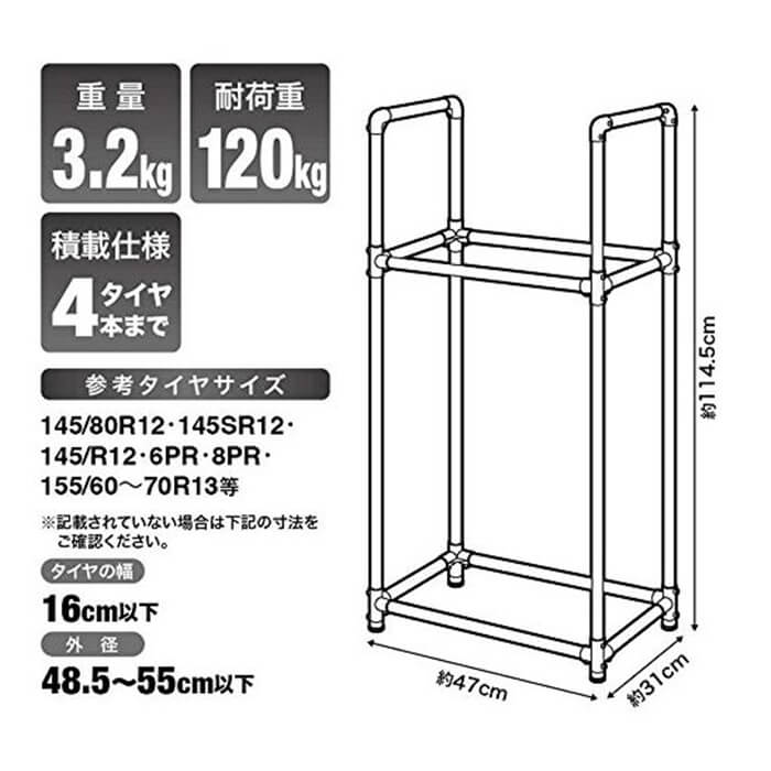 ■タイヤの幅:16cm以下 ■外径:48.5〜55cm以下 【商品詳細】 商品サイズ:(約)幅47×奥行31×高さ114.5cm 本体重量:(約)3kg 耐荷重:(約)120kg 素材:ステンレスクラッドφ25.4MM/厚:0.6MM 部品:PP樹脂 積載仕様:4本 JAN:4545244216801 【ご必読下さいませ】 モニターにより、色の見え方が実際の商品と異なる場合がございます。